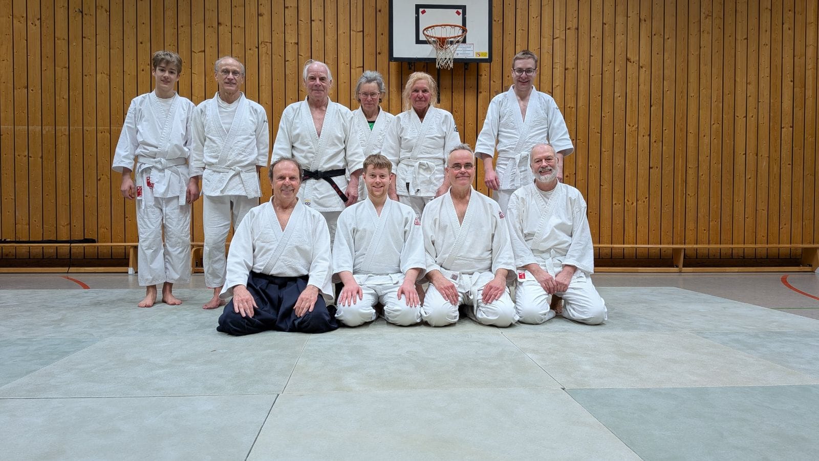 Thomas Bauer (erste Reihe, zweiter von links) nach erfolgreicher Prüfung zum dritten Kyu zusammen mit Prüfer Roland Hofmann (erste Reihe links).